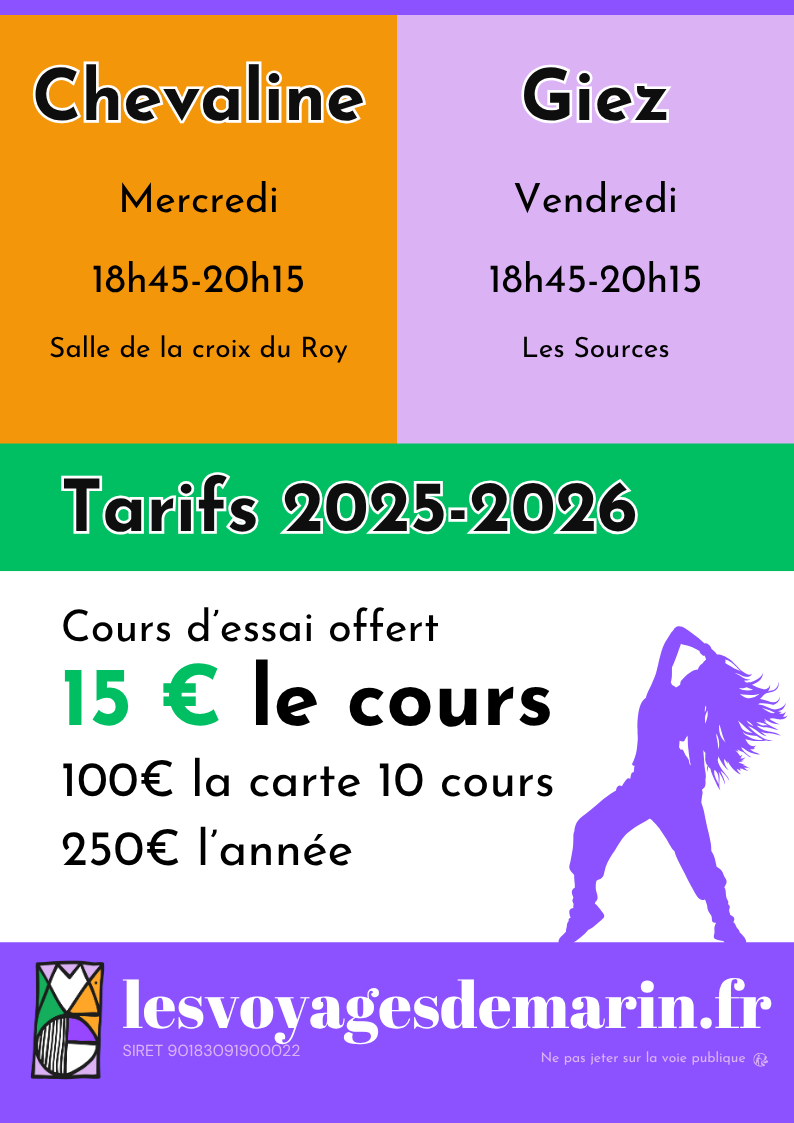 2 cours de danse d’1h30 par semaine sont proposés du 3 septembre 2025 au 26 juin 2026 aux Sources du lac d’Annecy, sur les communes de Chevaline et de Giez.